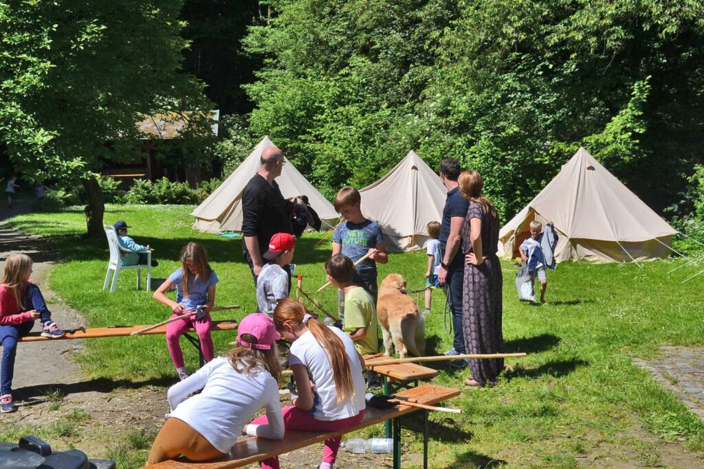 Außerdem kann man Bogenschießen, am Lagerfeuer sitzen, schnitzen und vieles mehr. Dabei besteht die einmalige Chance, mitten im Naturschutzgebiet Siebengebirge, auf der Wiese hinter dem Forsthaus Lohrberg, in Großzelten zu übernachten. Im Sinne der Bildung für nachhaltige Entwicklung (BNE) können die Kinder unter Anleitung eines erfahrenen Biologen und eines Försters spielerisch das ökologische Zusammenspiel von Tieren und Wald erkunden. Hierbei werden waldpädagogische Aktionen zu den Themen Wildnis, Jagd und Wolf durchgeführt sowie Molchen, Kröten und Schlangen nachgestöbert. Praktische Arbeit für die Umwelt und eine Reflexion des Erlebten sind Bestandteil des Programms. Besonders sollen jedoch auch Spaß und Abenteuer für die jungen Naturforscherinnen und Naturforscher nicht zu kurz kommen.